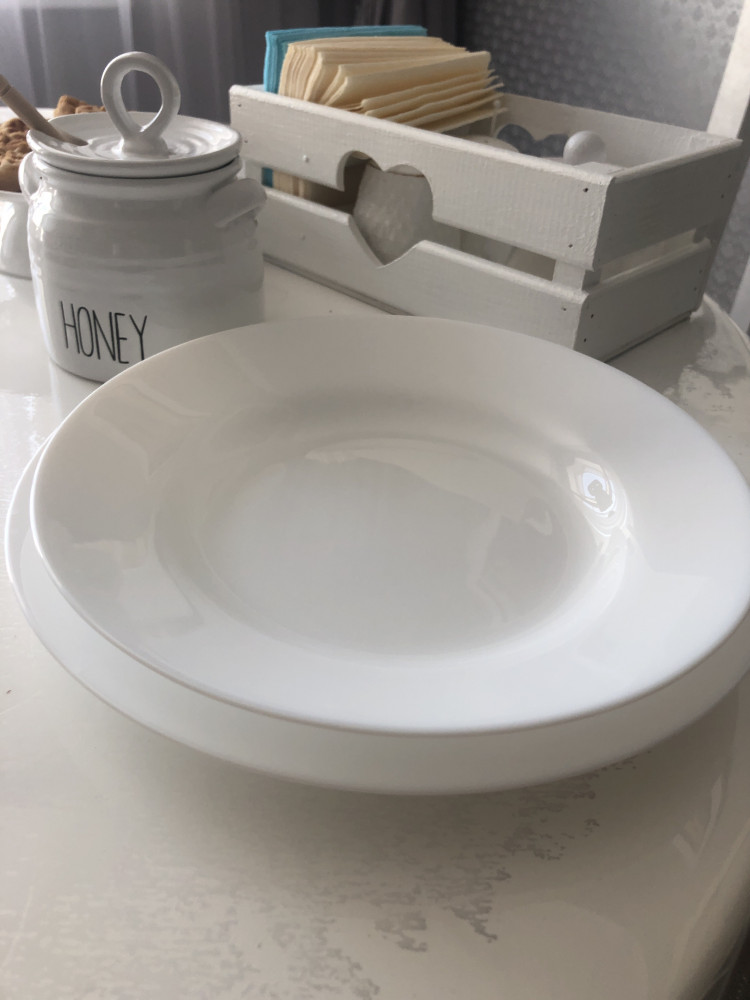 Посуда понравилась, белоснежная и тонкая. На первом фото цвет маленьких тарелок отличается, но это только сбоку. Все супер в будущем буду докупать ещё.