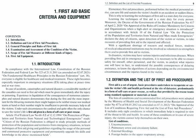 Tutorial guide contains the basic principles of fi rst aid in emergency situations and accidents in accordance with contemporary algorithms and recommendations of the fi eld-specifi c commission of the Ministry of Health of the Russian Federation, guidelines of Russian and European specialized medical societies and councils. Study guide highlights nine principle topics of the subject «First aid practice in case of accidents and disasters» and module «First Aid» as a part of the subject «Life Safety in Medicine» and has been prepared in accordance with the latest changes of the Federal State Educational Standard, the manual refl ects all modern updated algorithms for first aid and basic cardiopulmonary resuscitation, contains key questions for each part as well as provisional tests for the students’ self-check. This course book can be helpful for the students taught by means of e-educational systems (including distant learning). |