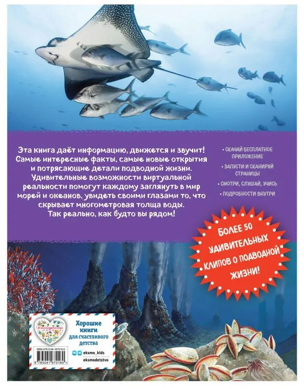 Книга нового поколения. Удивительные возможности дополненной реальности помогут каждому заглянуть в подводный мир, побывать на дне и среди коралловых рифов, увидеть светящихся существ на больших глубинах и послушать дельфинов и китов. Весь водный мир — в превосходных иллюстрациях и интереснейших и неожиданных фактах.