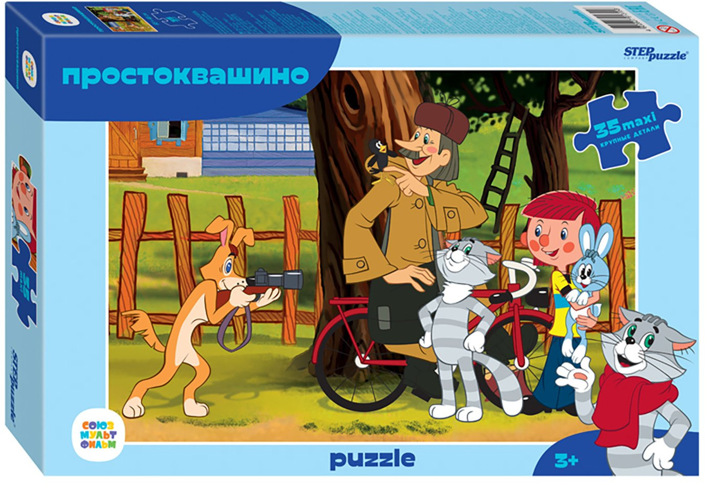 Пазл «Простоквашино» состоит из 35 крупных деталей. Его картинка дублирует известную сцену из мультфильма: ту самую, где Шарик фотоохотой занимается. Пазл состоит из 35 крупных деталей.