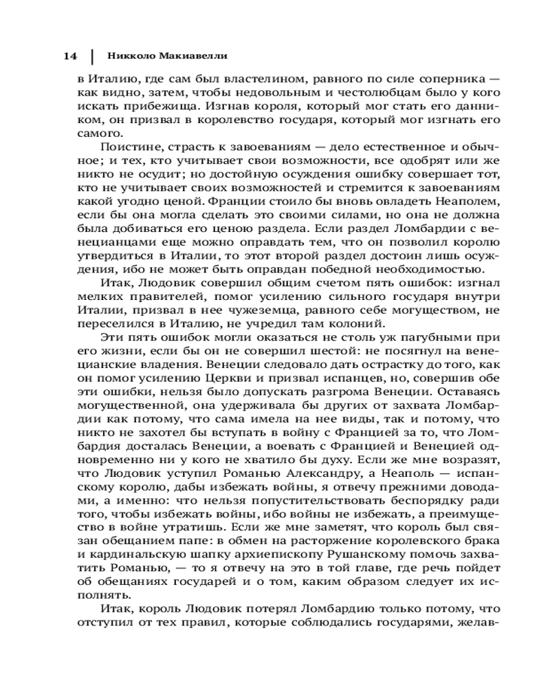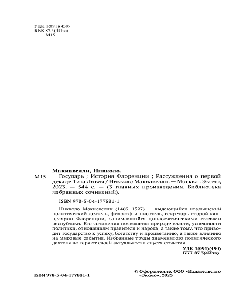 Государь. История Флоренции. Рассуждения о первой декаде Тита ЛивияНикколо Макиавелли (Макьявелли) В данный момент этот товар отсутствует в продаже. Возможно, у нас найдется аналогичный или похожий товар здесь. Серия: 3 главных произведения. Библиотека избранных сочинений В книге «Государь. История Флоренции. Рассуждения о первой декаде Тита Ливия» собраны три главных произведения Никколо Макиавелли, раскрывающие его взгляды на политику, развитие государства и феномен власти. Идеи выдающегося политика, философа и писателя Возрождения до сих пор остаются актуальными для всех, кого интересует как политика родной страны, так и международные отношения. |
