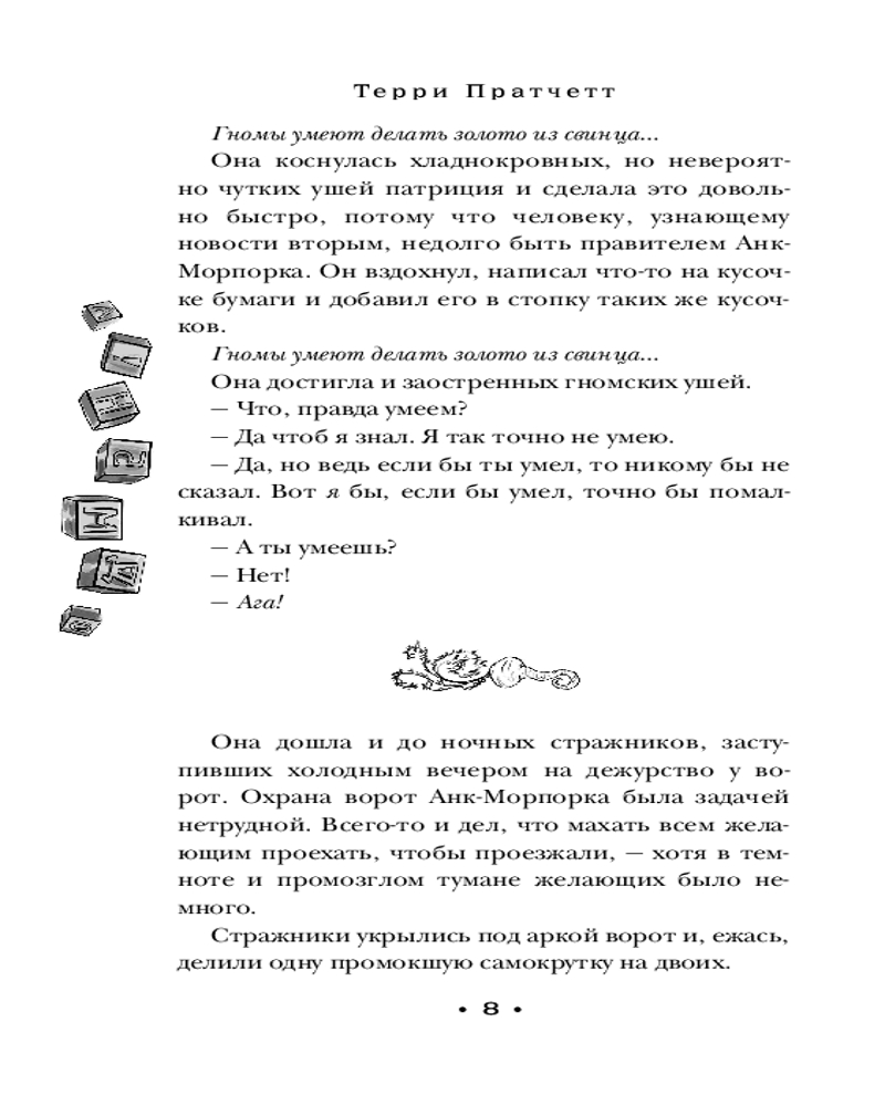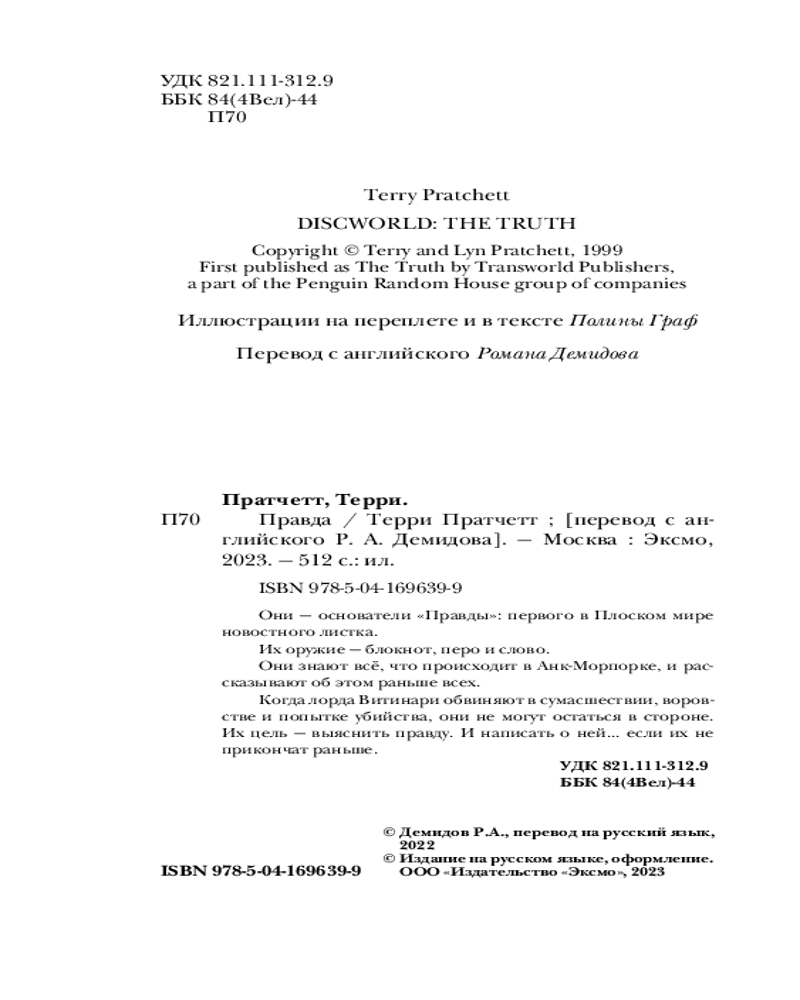 ПравдаВ данный момент этот товар отсутствует в продаже. Возможно, у нас найдется аналогичный или похожий товар здесь. Серия: Магия Терри Пратчетта в иллюстрациях Полины Граф Они — основатели «Правды»: первого в Плоском мире новостного листка. Их оружие — блокнот, перо и слово. Они знают всё, что происходит в Анк-Морпорке, и рассказывают об этом раньше всех. Когда лорда Витинари обвиняют в сумасшествии, воровстве и попытке убийства, они не могут остаться в стороне. Их цель — выяснить правду. И написать о ней... если их не прикончат раньше. |