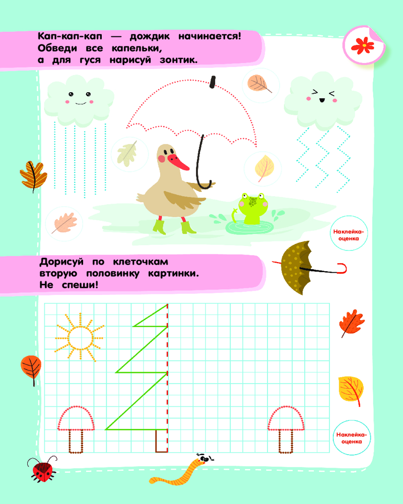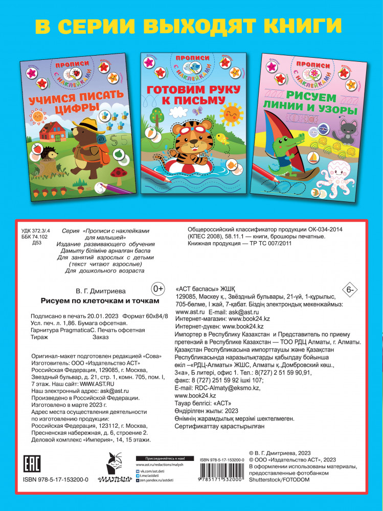 Серия: Прописи с наклейками для малышей «Рисуем по клеточкам и точкам» — универсальные развивающие прописи для будущих первоклассников. На страницах рабочей тетради — интересные игровые сюжеты, которые помогут увлечь ребёнка. А забавные разноцветные наклейки-оценки позволят малышу самостоятельно оценить свои успехи. Дошколята учатся ориентироваться на листе бумаги, умело обращаться с ручкой, карандашом, потренируются проводить линии, рисовать по клеточкам и точкам, обводить, дорисовывать. Упражнения тренируют внимание, мышление, речь, развивают мелкую моторику и координацию движений. С замечательной книжкой малыши замечательно проведут время. Благодаря ярким и весёлым наклейкам каждое задание станет маленькой игрой: полезной и интересной. |