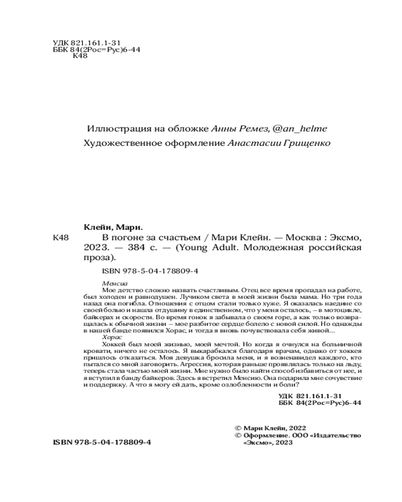 В данный момент этот товар отсутствует в продаже. Возможно, у нас найдется аналогичный или похожий товар здесь. Серия: Young Adult. Молодежная российская проза «В погоне за счастьем» — искренняя и трогательная история о двух израненных душах, нашедших друг друга. Дебют российской писательницы Мари Клейн! Роман о любви, скорости, потере и семье! Придется по душе фанатам сериала «Эйфория», а также поклонникам творчества Тилли Коул и Эммы Скотт!