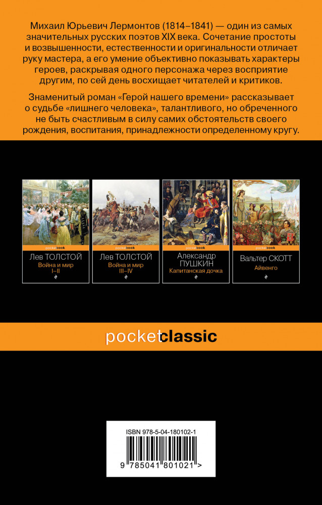Серия: Pocket book (обложка). Русская классика Михаил Лермонтов — один из наиболее влиятельных русских писателей и поэтов XIX века, яркий представитель романтизма, певец любви и печали, любитель древних легенд и дерзкий дуэлянт. «Герой нашего времени» — первый в русской прозе психологический роман. Его главный герой, Григорий Печорин, холодный циник, не верящий в высокие идеалы, живущий «не сердцем, а головою», эгоистичный прожигатель жизни, бросающий женщин и бесстрашно испытывающий судьбу. Настоящий продукт эпохи «безвременья». |