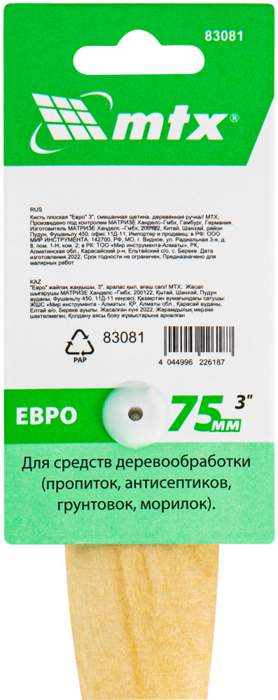 Серия: Евро Плоская кисть MTX «Евро» шириной 3″, с искусственной щетиной и деревянной ручкой, предназначена для малярных работ. Оптимальна для работы с водорастворимыми ЛКМ (акриловыми, латексными, водоэмульсионными), удобна для обработки участков небольшой площади. Кисть подходит для профессионального использования. |