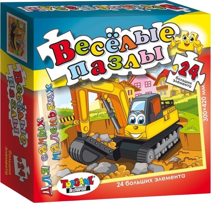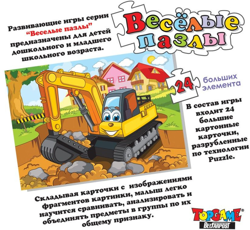 TopGame Пазл «Экскаватор»В данный момент этот товар отсутствует в продаже. Возможно, у нас найдется аналогичный или похожий товар здесь. Серия: Веселые пазлы Пазл развивает мелкую моторику рук, способствует развитию образного и логического мышления, внимания, легко научит вашего малыша различать отдельные элементы по цвету, форме, а также правильно воспринимать связь между частью и целым. |