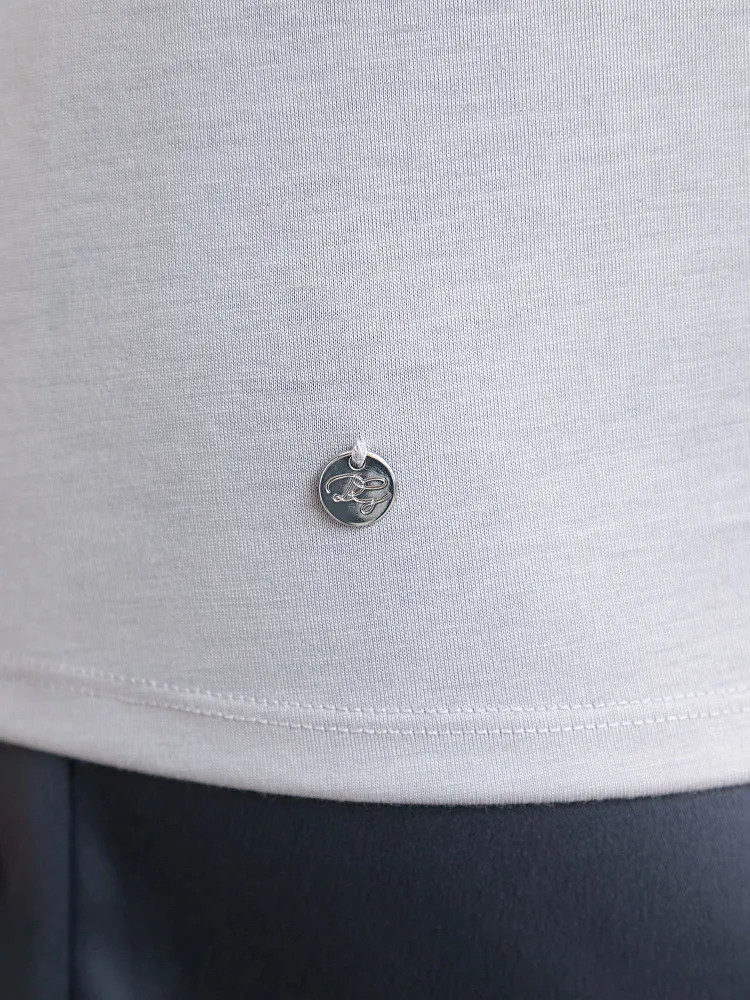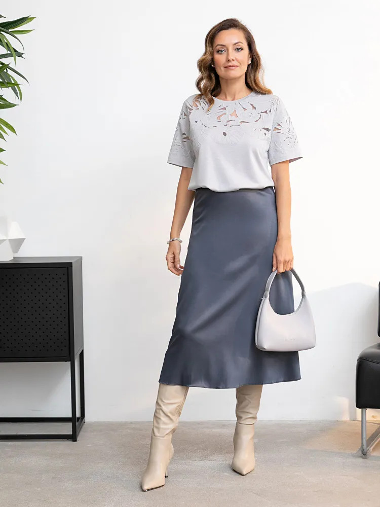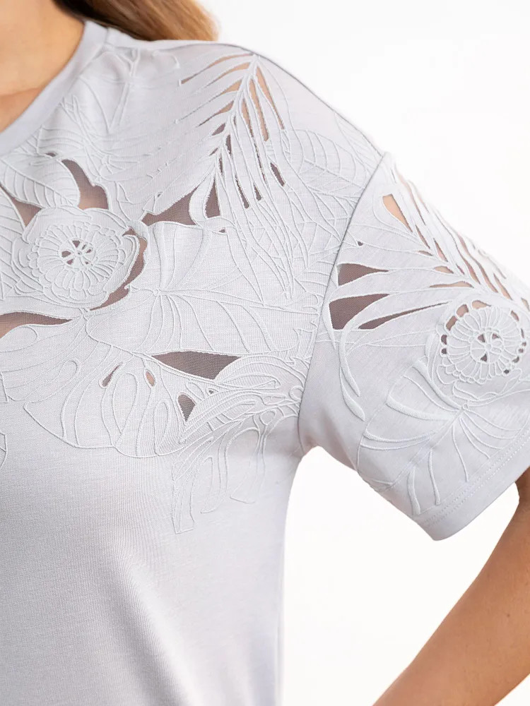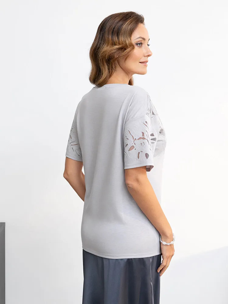 Футболка понравилась.Ткань имеет блеск,не матовая.Ношу 48-й размер,такой и взяла,но оказалась по ширине спинки большая,как на 50-й размер.Но это не критично для меня.Качественный пошив.Своих денег стоит.Спасибо магазину.