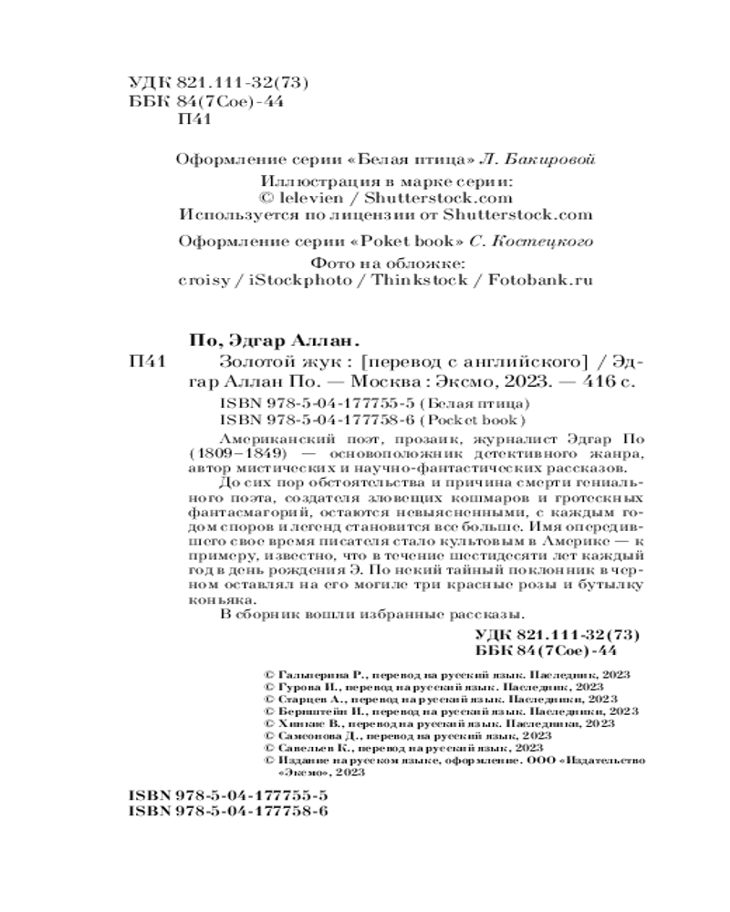 💳 Оплатить за товар можно при получении 🇰🇿 Есть бесплатная доставка по Казахстану 🎁 Копите бонусы с каждой покупки Серия: Белая птица Американский поэт, прозаик, журналист Эдгар По (1809-1849) — основоположник детективного жанра, автор мистических и научно-фантастических рассказов. |