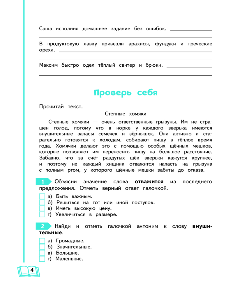 Тренажёр по русскому языку для учеников 4 класса удобен и прост в использовании. Разнообразие типов заданий будет стимулировать постоянный интерес к их выполнению. Успешное выполнение заданий повышенной сложности позволит четверокласснику расширить границы своих компетенций, поверить в свои силы, научит проявлять гибкость мышления и применять на практике полученные знания. |