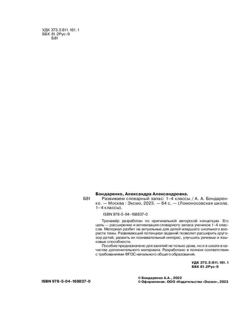 Тренажёр разработала А. А. Бондаренко, филолог с многолетним педагогическим стажем, автор многих учебных пособий, в том числе букварей, выдержавших множество изданий. В сферу её научных интересов входят русский язык и методика его преподавания, культура речи, русский язык как иностранный, отечественная и зарубежная букваристика. Благодаря прогрессивной авторской методике ученики начальной школы значительно увеличат и активизируют свой словарный запас, улучшат речевые и языковые способности, а также расширят общий кругозор. |