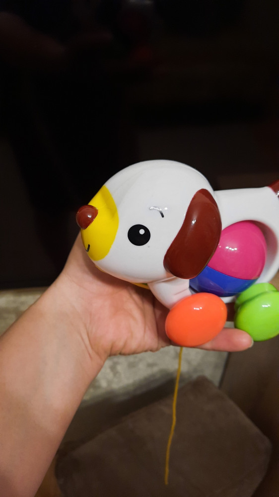 собачка просто огонь! прекрасного качества, яркая, прочная, без посторонних запахов, достаточно крупная, когда едит, шарик в животе крутится и гремит. Дочери 9 мес. очень понравилась.