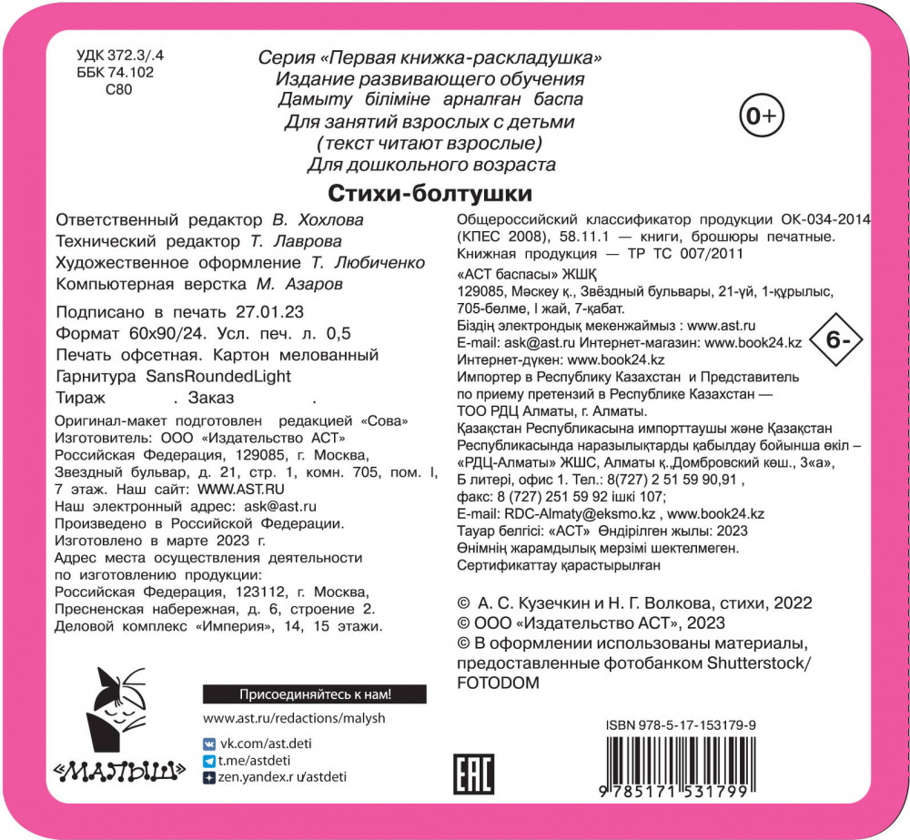 В данный момент этот товар отсутствует в продаже. Возможно, у нас найдется аналогичный или похожий товар здесь. Серия: Первая книжка-раскладушка «Стихи-болтушки» — книга, которая поможет ребёнку заговорить. Простые стихи стимулируют сложные процессы нервной системы.