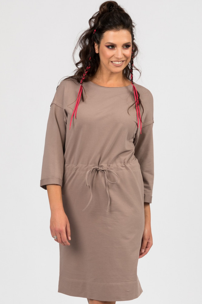 Платье женское прямого силуэта, с разрезами в боковых швах, с кулисой по талии. Горловина круглая. На середину спинки настрочена деталь с печатью. Плечо спущенное, рукав втачной 3/4. В кулису вдет шнур, заготовленный из окантовочной бейки из основного сырья. Горловина спинки окантована бейкой, горловина переда обработана обтачкой с открытыми срезами.