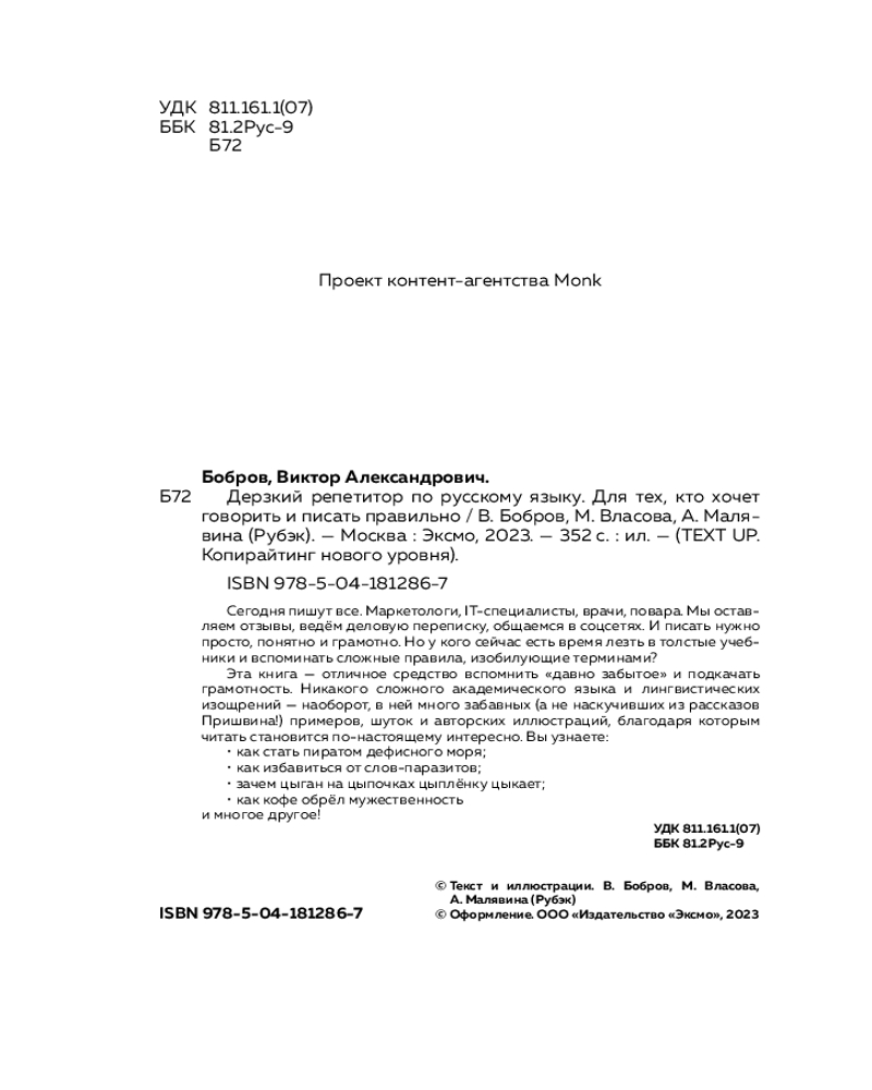 Серия: TEXT UP. Копирайтинг нового уровня Сегодня пишут все. Маркетологи, IT-специалисты, врачи, повара. Мы оставляем отзывы, ведём деловую переписку, общаемся в соцсетях. И писать нужно просто, понятно и грамотно. Но у кого сейчас есть время лезть в толстые учебники и вспоминать сложные правила, изобилующие терминами? Эта книга — отличное средство вспомнить «давно забытое» и подкачать грамотность. Никакого сложного академического языка и лингвистических изощрений, наоборот, в ней много забавных (а не наскучивших, из рассказов Пришвина!) примеров, шуток и авторских иллюстраций, благодаря которым читать становится по-настоящему интересно. |