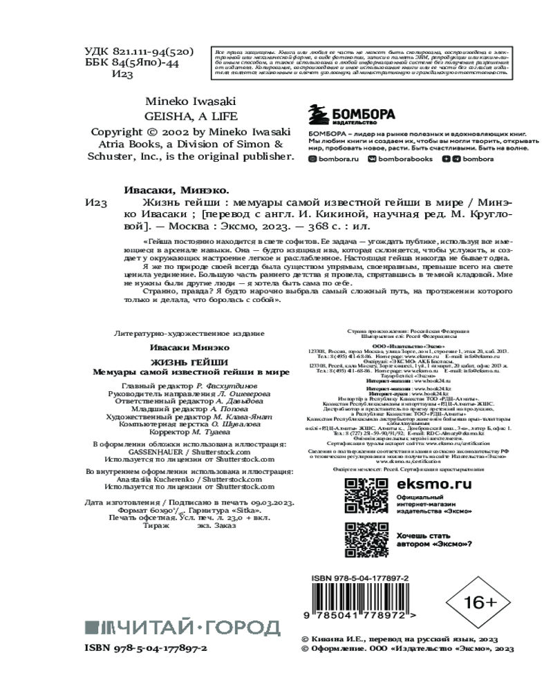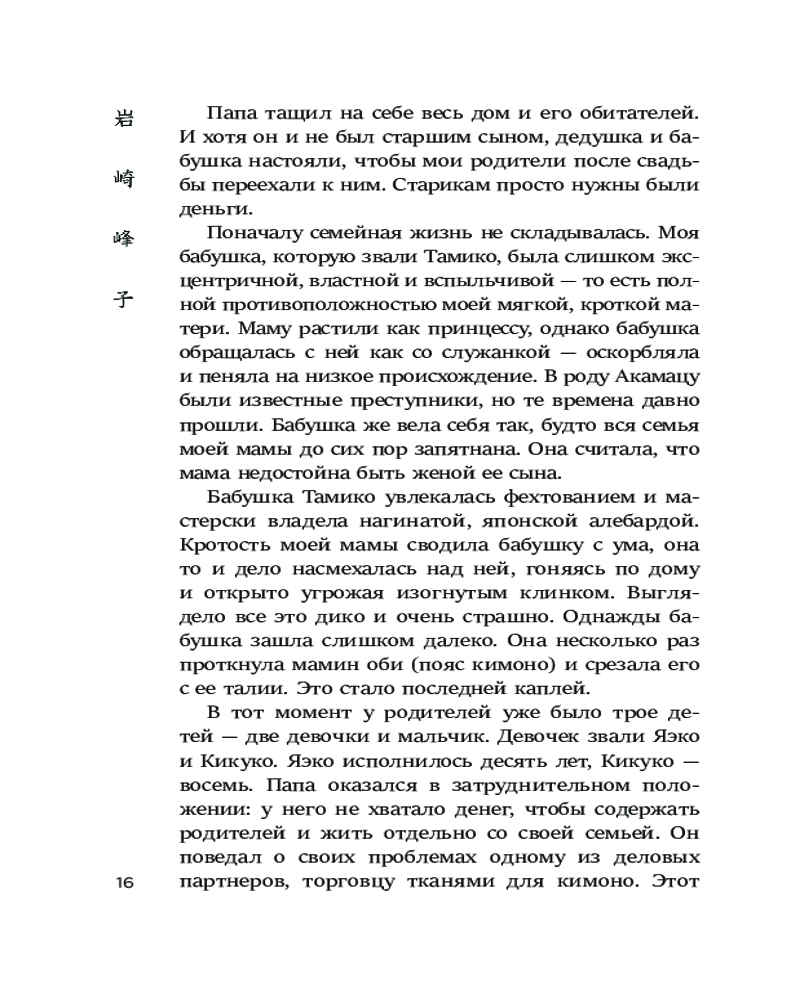 Жизнь гейши. Мемуары самой известной гейши в миреинтересное содержание легко читается удобный переплет фотографии В данный момент этот товар отсутствует в продаже. Возможно, у нас найдется аналогичный или похожий товар здесь. Серия: Замок из стекла. Книги о сильных людях и удивительных судьбах Жизнь Минэко Ивасаки была описана в бестселлере Артура Голдена «Мемуары гейши». По книге был снят одноименный фильм. Но Артур Голден допустил множество ошибок и неточностей, смешав, по мнению Минэко, искусство красоты с развратностью. И тогда она решила издать свои мемуары, где откровенно рассказала истинную правду о своей жизни. |