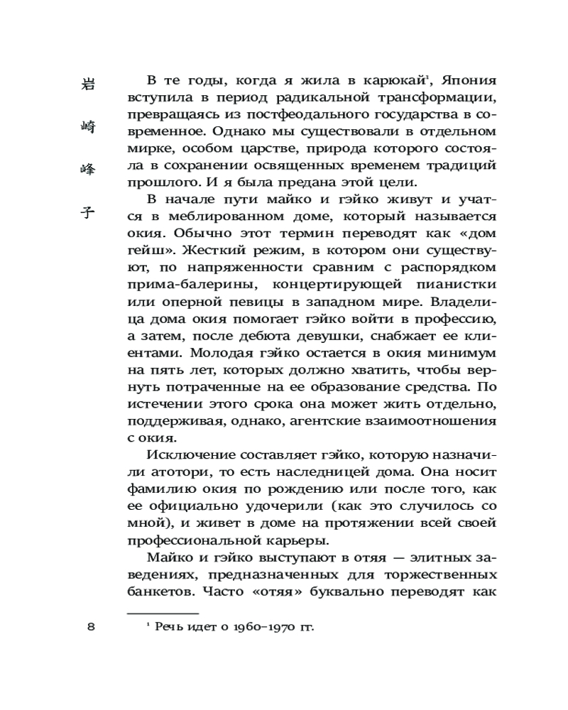 Отличная книга, приятно и легко читать, отлично передает атмосферу Японии и в частности культуры домов гейш