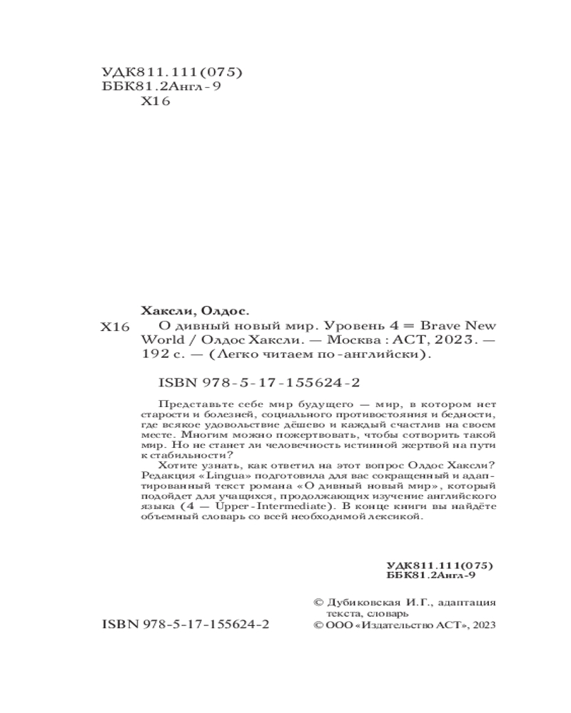 💳 Оплатить за товар можно при получении 🇰🇿 Есть бесплатная доставка по Казахстану 🎁 Копите бонусы с каждой покупки Серия: Легко читаем по-английски Представьте себе мир будущего — мир, в котором нет старости и болезней, социального противостояния и бедности, где всякое удовольствие дёшево и каждый счастлив на своём месте. Многим можно пожертвовать, чтобы сотворить такой мир. Но не станет ли человеческое истинной жертвой на пути к стабильности? |