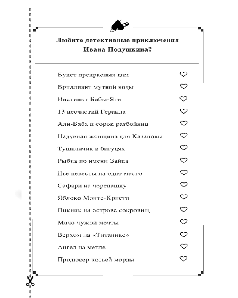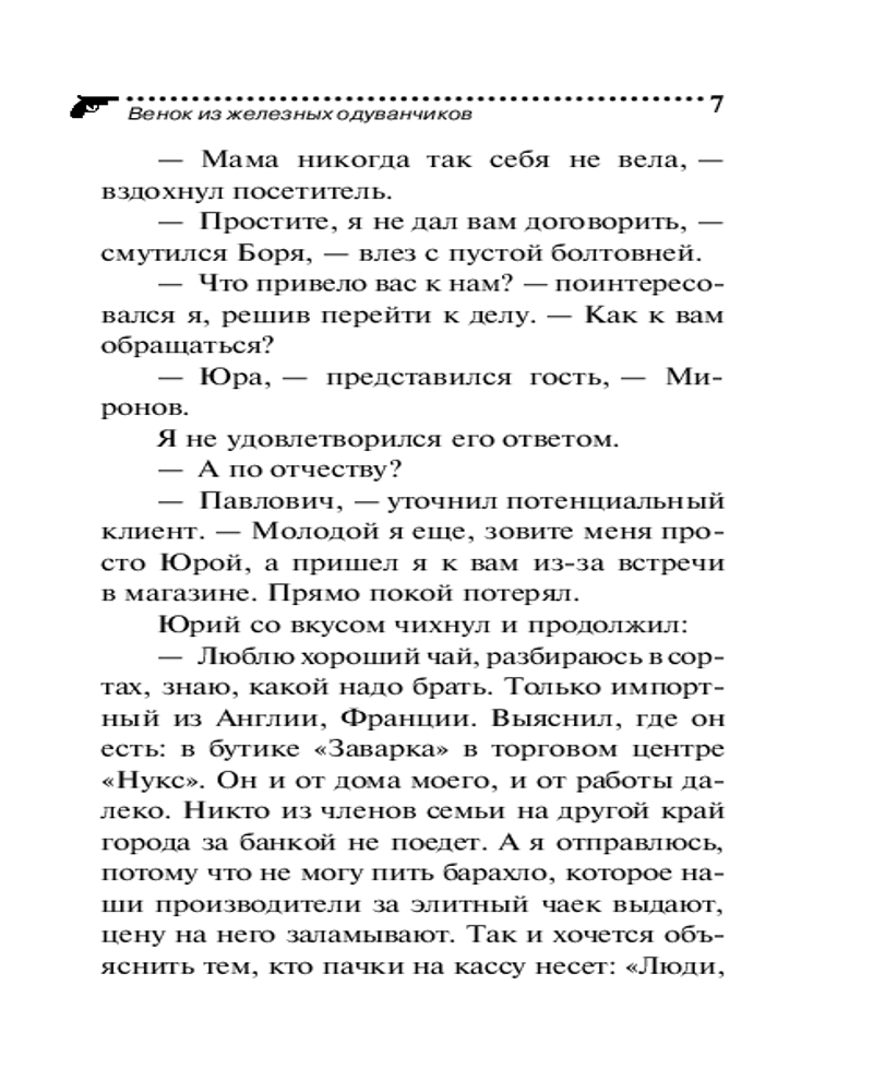Венок из железных одуванчиковВ данный момент этот товар отсутствует в продаже. Возможно, у нас найдется аналогичный или похожий товар здесь. Серия: Иронический детектив (обложка) Больше всего Иван Павлович Подушкин любит проводить время с хорошей книгой. Но по закону подлости, каждый раз, когда частный детектив устраивается поуютнее с томиком любимого автора в руках, раздается звонок в дверь, и в офисе появляется очередной клиент. Сегодня посетителем оказался Юрий Миронов, который уверен: он видел в торговом центре свою маму. Что в этом странного? Женщины любят делать покупки. Вот только Екатерина Семеновна умерла несколько месяцев назад. А вскоре на тот свет отправились теща и тесть Юры. Причем ушли во сне — инфаркт, инсульт. Но ведь они ничем таким не болели... Юрий подозревает, что их смерть могла быть выгодна Андрею — дружку Дуси, сестры его жены. Он колдун, мошенник, разводит людей на деньги и вполне мог позариться на наследство. Миронов просит Подушкина вывести злодея на чистую воду. И ответить на вопрос: что его покойная мать делала в магазине? |