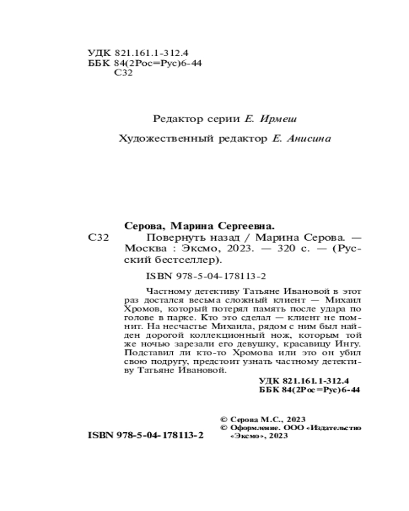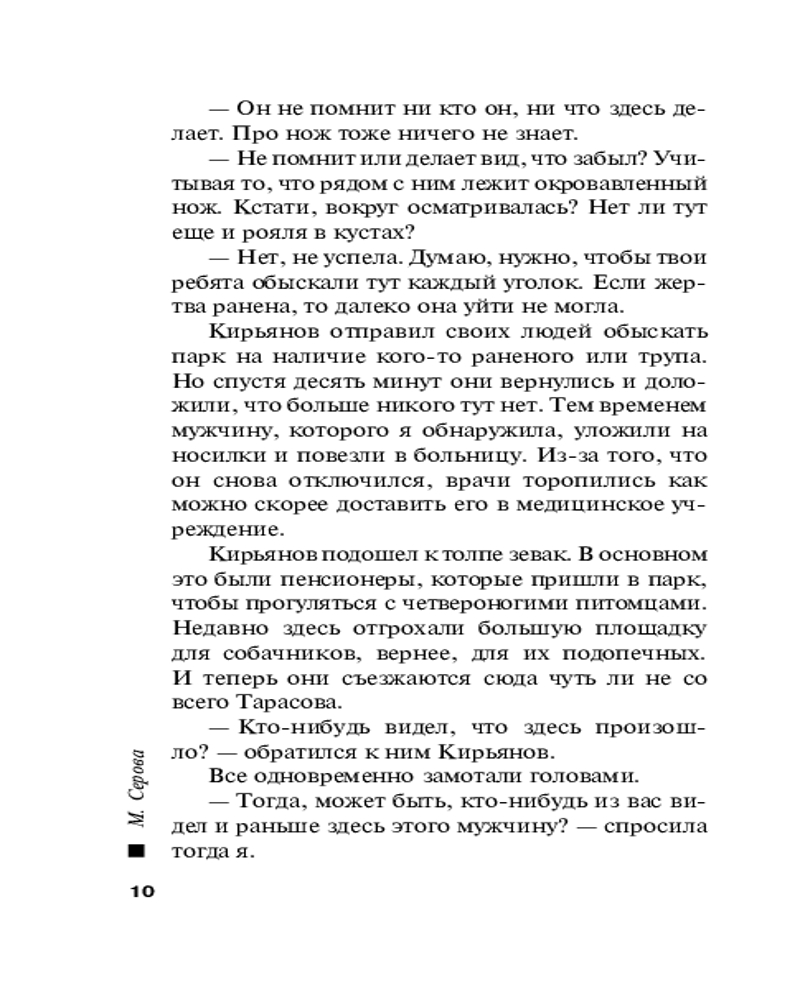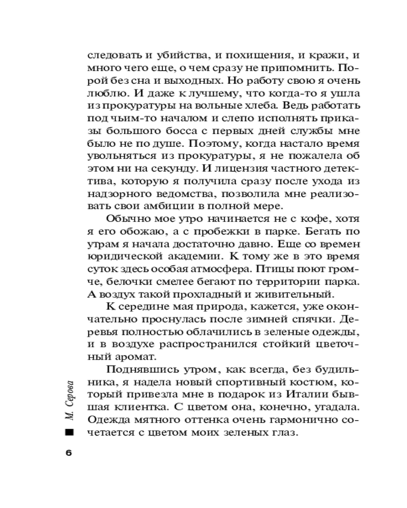 | Марина Сергеевна Серова — один из ведущих авторов серии современного русского детективного жанра (существует версия, что это коллектив авторов под общим руководством литературного агента Сергея Потапова). Согласно легенде, «выпускница юридического факультета МГУ, работала в Генеральной прокуратуре, сотрудница одной из спецслужб, участвовала в боевых операциях». Между тем написала 425 произведений размером порядка 200 страниц (и число их постоянно увеличивается). Часть произведений... |