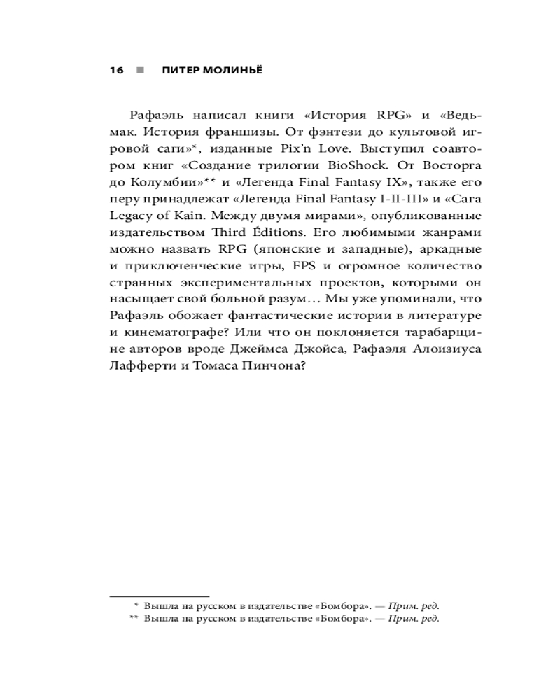 Серия: Легендарные компьютерные игры Питер Молинье — одна из самых популярных, уважаемых и противоречивых фигур в индустрии видеоигр. Каким его только не называют — гениальным, амбициозным, легкомысленным, импульсивным... Он создал жанр «симулятор бога» и значительно повлиял на развитие RPG, а многие игры, к которым он приложил руку, навсегда вошли в историю.\n В этой книге рассказывается о жизни и карьере легендарного разработчика от юности до зрелых лет. Автор Рафаэль Люка долгое время беседовал с Питером Молинье, чтобы составить наиболее полный портрет его личности. Воспоминания о семье, первые успехи в конце 1980-х годов, опыт ведения бизнеса, смена компаний, история разработки Populous, Syndicate, Magic Carpet, Fable и других знаменитых игр. Питер Молинье без утайки рассказывает о своих успехах и неудачах, об источниках вдохновения, ошибках и воображаемых мирах.\n Пришло время узнать: настоящий Питер Молинье — каков он?\n \n «Если вам всегда хотелось узнать, где зародился мир фантазий Питера Молинье, то эта книга — отличный проводник в разум, быт и историю легендарного видеоигрового сказочника». — Даниил «Кортез» Петручик, автор «Мира Фантастики», ex-редактор DTF, игровой блогер. |