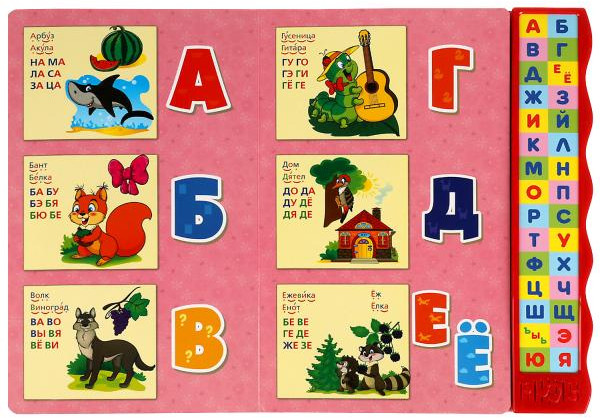 Эта яркая книга непременно привлечёт внимание малыша красивыми картинками, большими буквами и звуковыми кнопками. Он с удовольствием будет листать красочные страницы, слушать занимательные стихи и учить азбуку. Книга сделана из плотного картона, поэтому мамы могут не опасаться, что ребёнок порвёт странички.