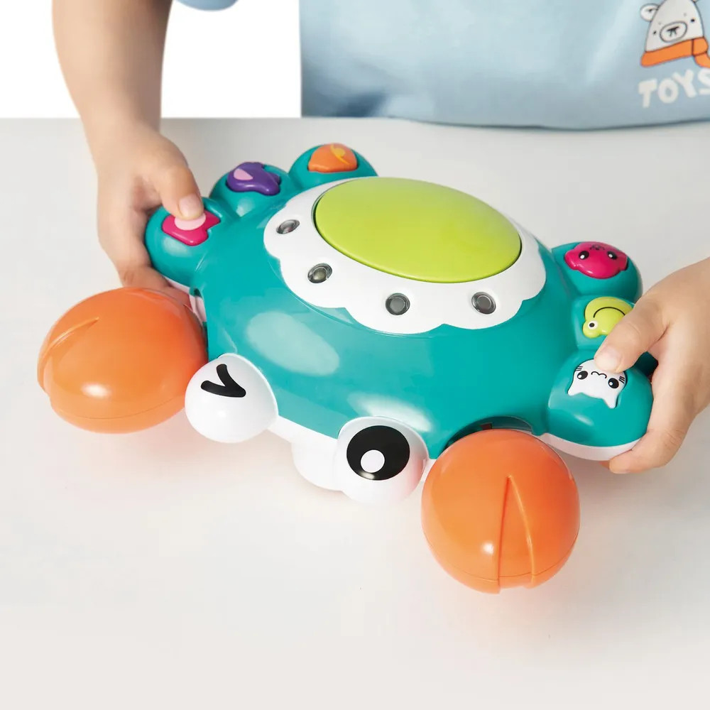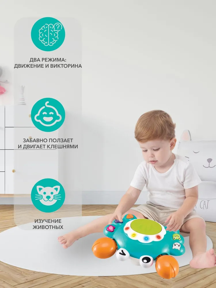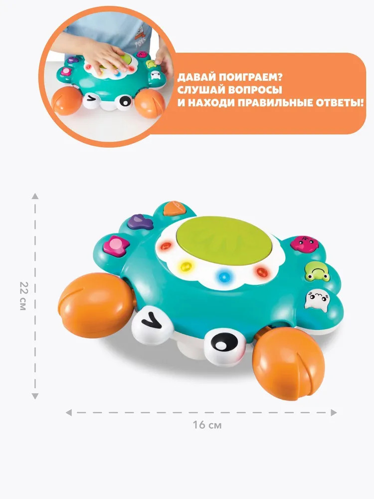 Я Ползающий краб 2в1! Мое любимое занятие не только ползать, но и играть в викторины! Где Котенок? А Лягушка? Угадай 4 раза, и я начну двигаться.