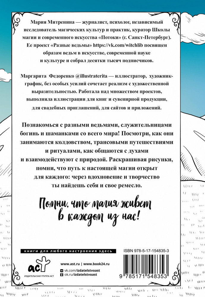 Разные ведьмы. Раскрась свою магиюВ данный момент этот товар отсутствует в продаже. Возможно, у нас найдется аналогичный или похожий товар здесь. Серия: Магическая тетрадь. Волшебная арт-терапия Познакомься с разными ведьмами, служительницами богинь и шаманками со всего мира! Посмотри, как они занимаются колдовством, трансовыми путешествиями и ритуалами, как общаются с духами и взаимодействуют с природой. Раскрашивая рисунки, помни, что путь к настоящей магии открыт для каждого: через вдохновение и творчество ты найдешь себя и свое ремесло. Помни, что магия живет в каждом из нас! |