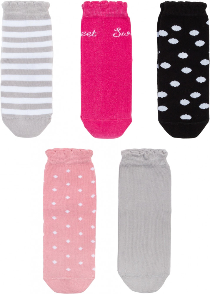 Мультипак из пяти пар детских носков. Носки изготовлены из высококачественного хлопка с добавлением небольшого количества полиамида и эластана, что обеспечивает комфортную посадку. Мягкая эластичная резинка хорошо фиксируется по ноге ребенка и не пережимает сосуды.