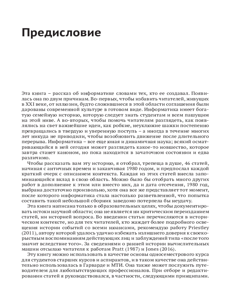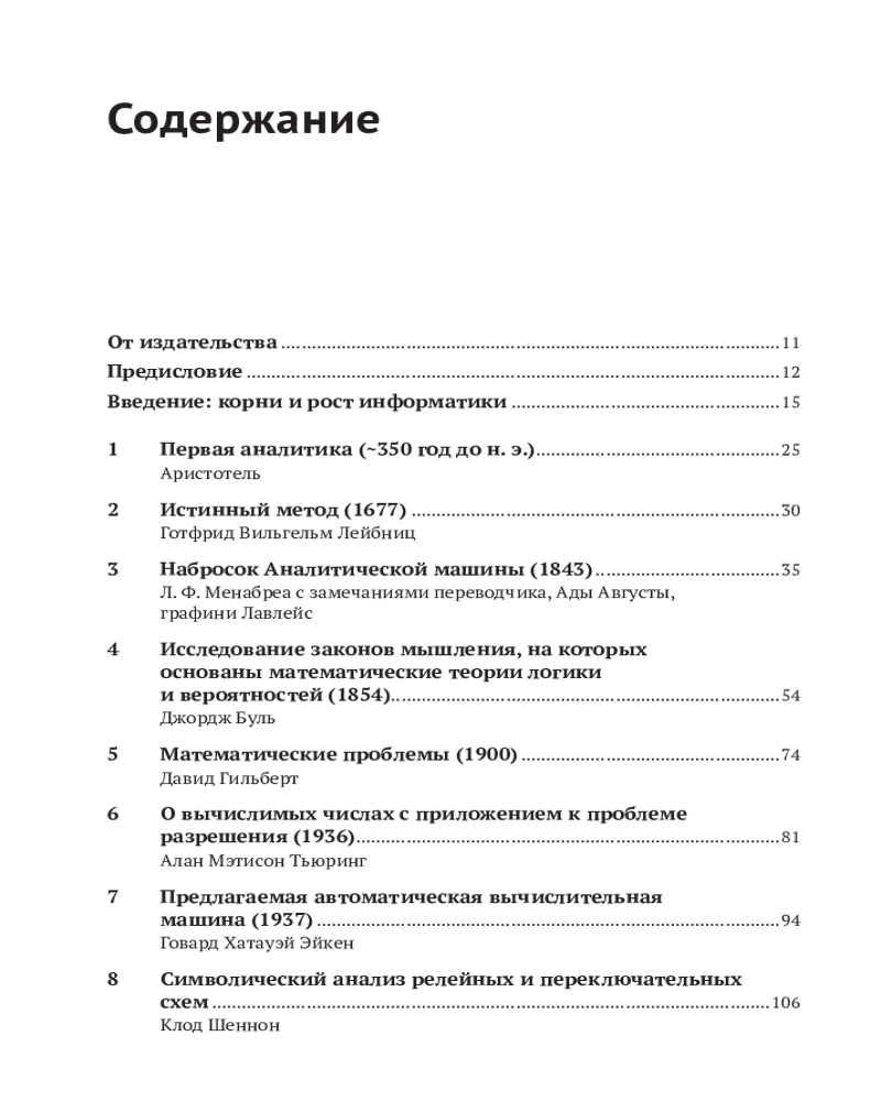 В книге собрано 46 классических статей по информатике, которые прочертили карту развития этой науки. Охвачены все аспекты компьютерных наук; особое внимание уделяется периоду с 1936 по 1980 годы, но рассматриваются и важные ранние работы. Знакомя читателей с работами мыслителей от Аристотеля и Лейбница до Алана Тьюринга и Норберта Винера, книга документирует открытия и изобретения, приведшие к созданию современного цифрового мира. Каждую статью сопровождает краткий очерк, где представлен исторический и интеллектуальный контекст, за авторством Гарри Льюиса, редактора издания. |