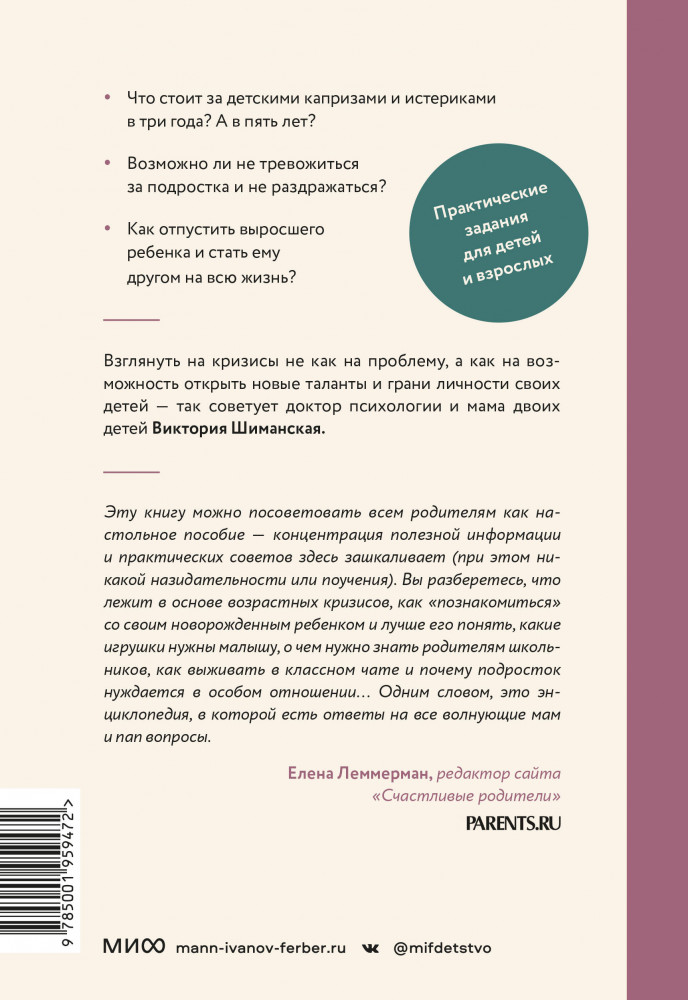 «Виктория Шиманская, доктор психологии и мама двоих детей, напоминает родителям: возрастной кризис — это не проблема, а вполне естественный этап, который связан с тем, что ребенок осваивает какой-то важный навык. Зная о том, как развивается малыш, мамы и папы смогут легче перестраиваться и принимать нюансы его взросления. Эту книгу можно посоветовать всем родителям как настольное пособие — концентрация полезной информации и практических советов здесь «зашкаливает» (при этом никакой назидательности или поучений). Вы разберетесь, что лежит в основе возрастных кризисов, как «познакомиться» со своим новорожденным ребенком и лучше его понять, какие игрушки нужны тоддлеру, о чем нужно знать родителям школьников и как выживать в классном чате, почему подросток нуждается в особом отношении и так далее. Одним словом, это энциклопедия, в которой есть ответы на все волнующие мам и пап вопросы». Елена Леммерман, редактор сайта «Счастливые родители», Parentsru |