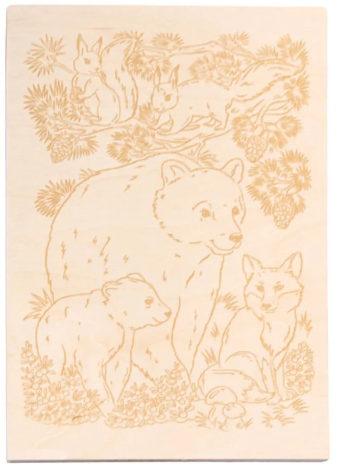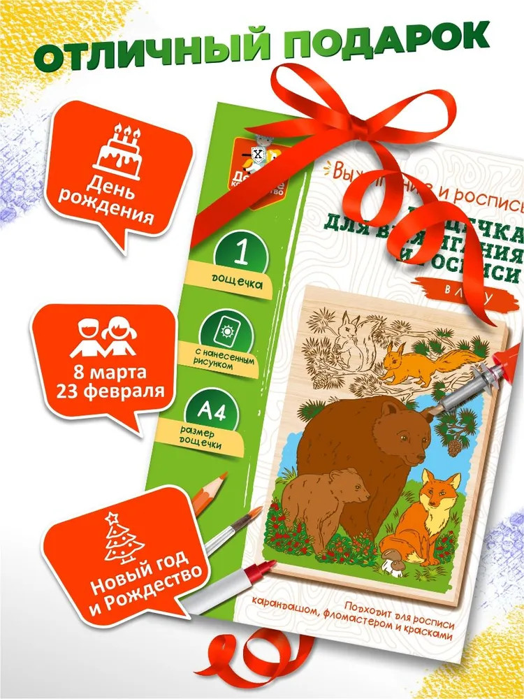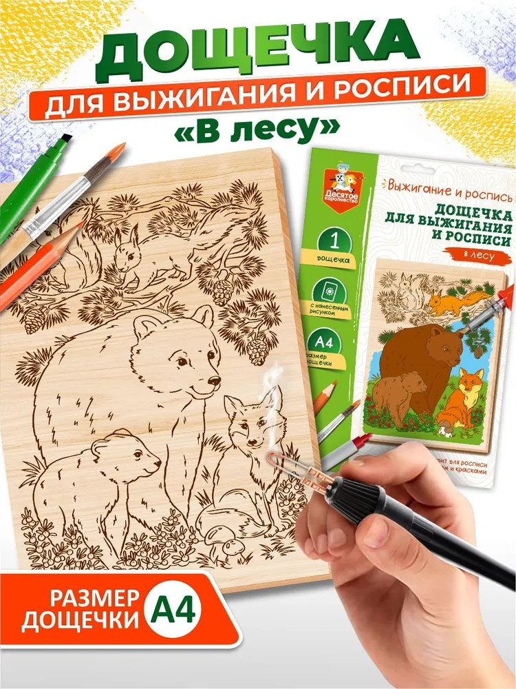 Выжигание по дереву - весьма распространенный вид прикладного искусства. Дощечка для выжигания и росписи «В лесу» - это замечательный подарок для любого ребенка, который поможет интересно провести время и реализовать творческие способности. Рисунок нанесен специальной краской, которая не выделяет вредные вещества в процессе выжигания. |