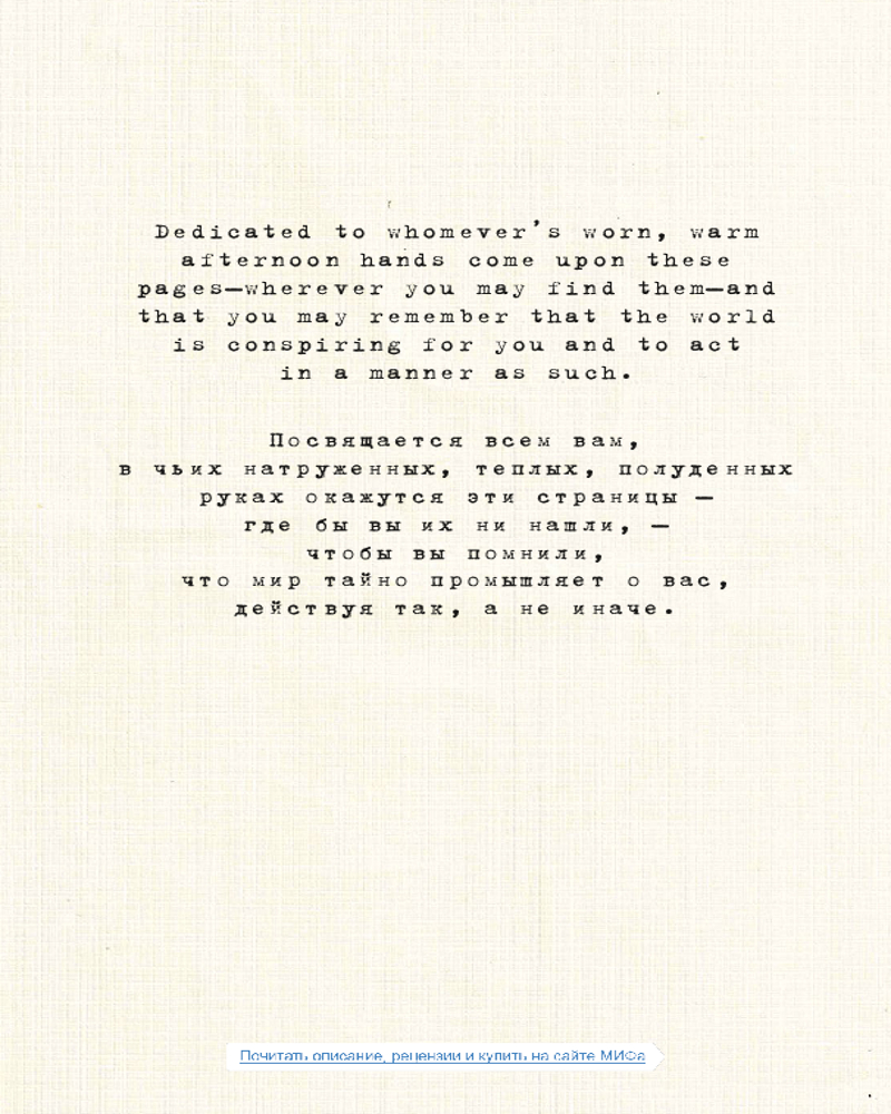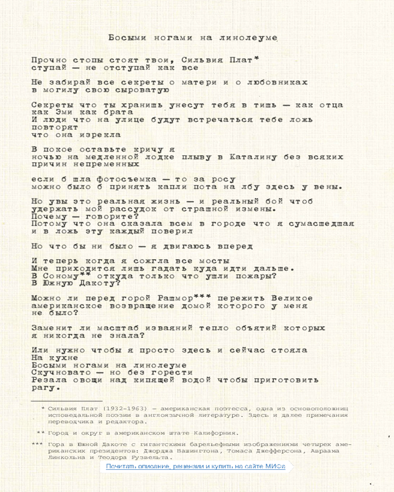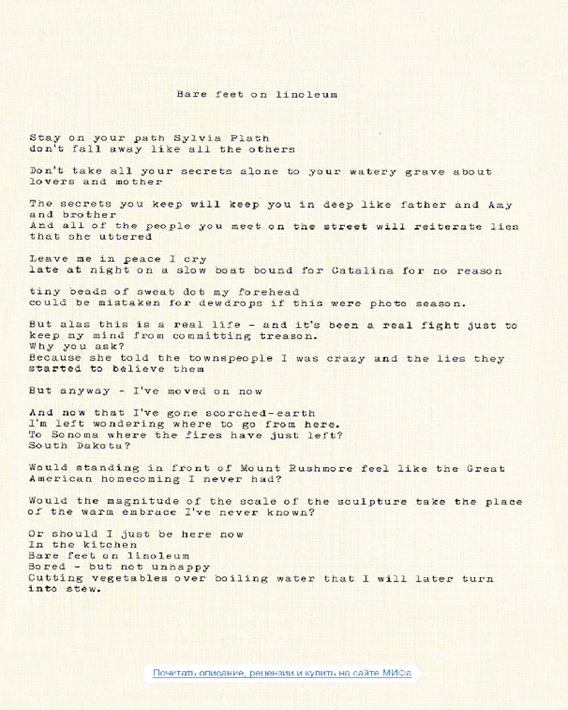 В сборник вошли более тридцати стихотворений, многие из которых являются эксклюзивными для книги. Страницы машинописного текста соседствуют здесь со сделанными Ланой фотографиями. В результате получился чувственный поэтический пейзаж, отражающий дух его создательницы. |