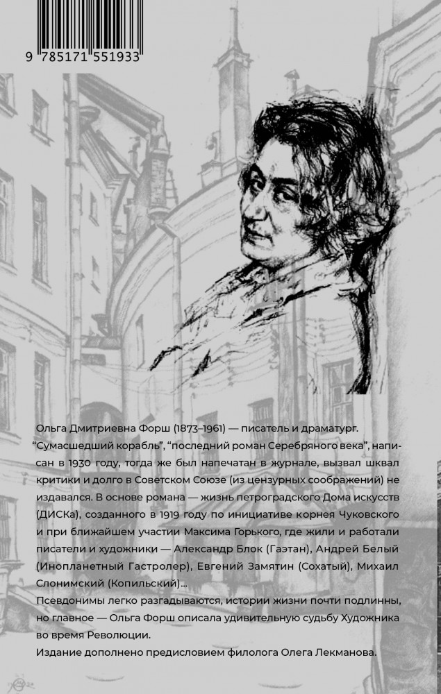 Серия: Исторические биографии «Сумасшедший корабль», «последний роман Серебряного века», написан в 1930 году, тогда же был напечатан в журнале, вызвал шквал критики и долго в Советском Союзе (из цензурных соображений) не издавался. В основе романа — жизнь петроградского Дома искусств (ДИСКа), созданного в 1919 году по инициативе Корнея Чуковского и при ближайшем участии Максима Горького, где жили и работали писатели и художники — Александр Блок (Гаэтан), Андрей Белый (Инопланетный Гастролер), Евгений Замятин (Сохатый), Михаил Слонимский (Копильский)... Псевдонимы легко разгадываются, истории жизни почти подлинны, но главное — Ольга Форш описала удивительную судьбу Художника во время Революции. |