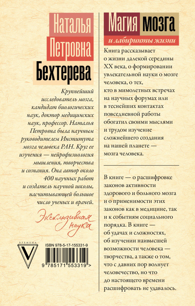 Серия: Эксклюзивная наука Наталья Петровна Бехтерева — крупнейший исследователь мозга, кандидат биологических наук, доктор медицинских наук, профессор. Наталья Петровна была научным руководителем Института мозга человека РАН. Круг ее изучения — нейрофизиология мышления, творчества и сознания. Она автор около 400 научных работ и создатель научной школы, насчитывающей большое число ученых и врачей. |