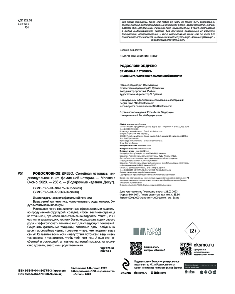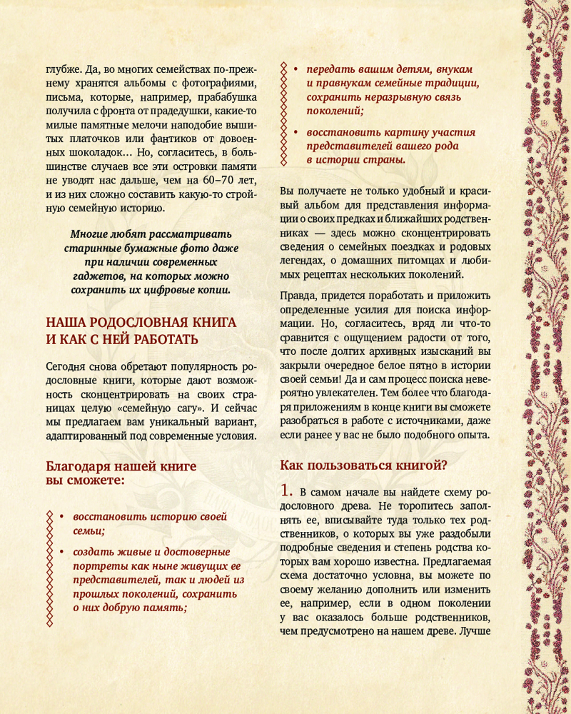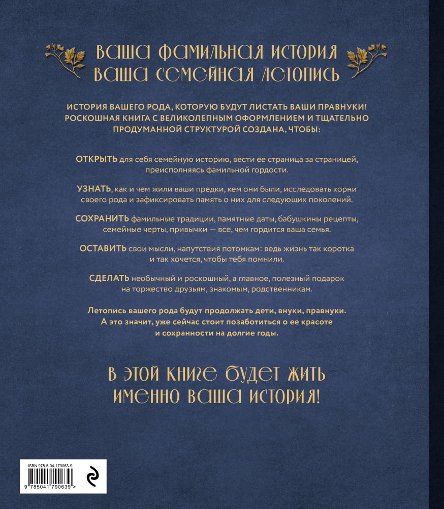 Серия: Подарочные издания. Досуг Уникальная родословная книга, которая не только поможет восстановить и бережно сохранить историю вашей семьи, но и создаст полный портрет ее нынешнего поколения, живущего в настоящем! Традиционное генеалогическое древо, география вашего рода, история фамилий, памятные даты и события — для всего найдется место на ее красивых страницах. А еще свой след оставят ваши родные и близкие, по крупицам восстанавливая и фиксируя каждую черточку, присущую вашей семье! Фамильные рецепты и поговорки, портреты любимых питомцев, самые яркие путешествия, совместные праздники — обо всем этом узнают ваши внуки и правнуки, листая эту роскошную книгу. Гаджеты устареют, а память о вас останется! |