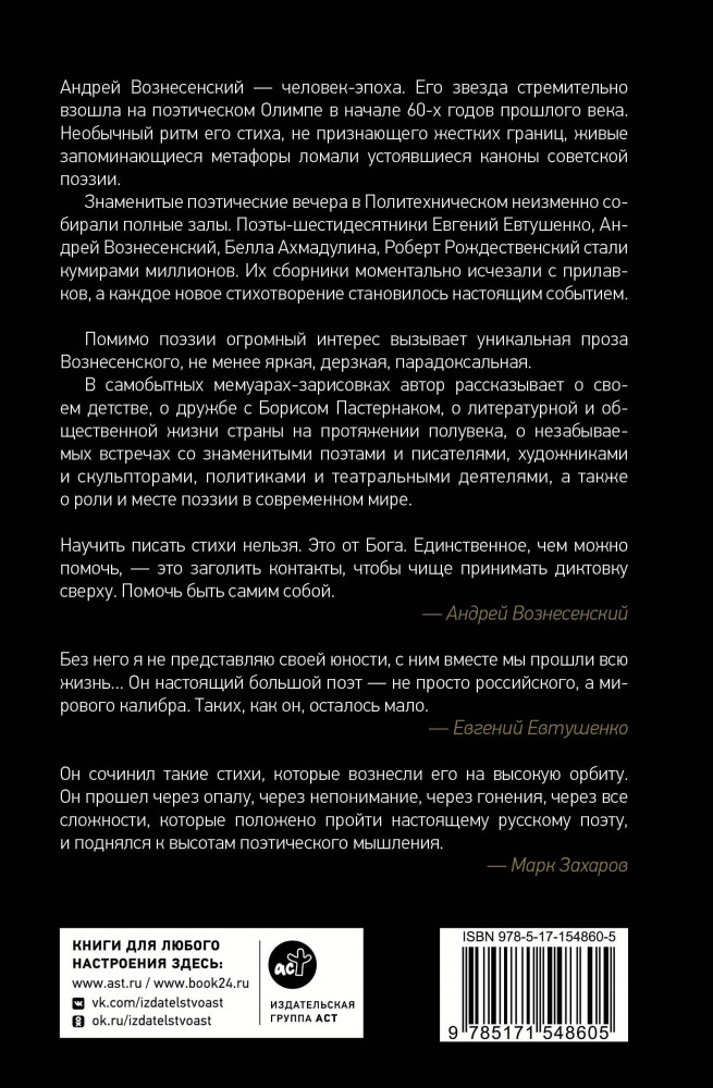 В данный момент этот товар отсутствует в продаже. Возможно, у нас найдется аналогичный или похожий товар здесь. Серия: Картина времени Имя поэта Андрея Вознесенского широко известно не только среди любителей поэзии. Вознесенский — человек-эпоха.