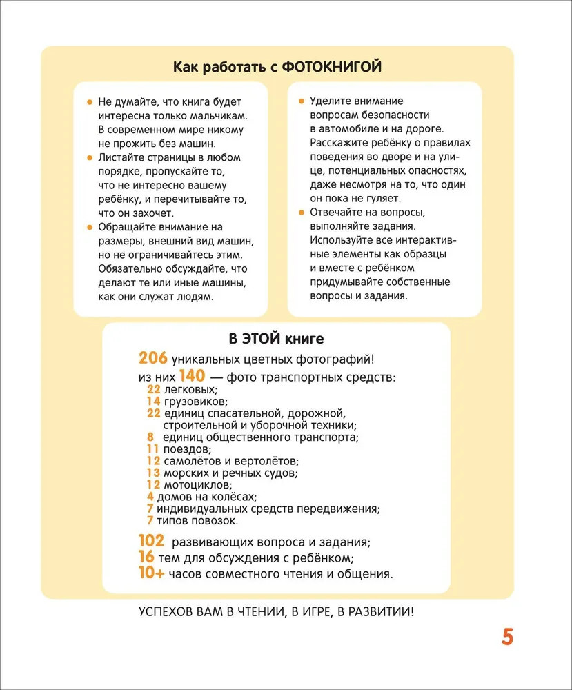 Машины. Твоя первая фотокнигаВ данный момент этот товар отсутствует в продаже. Возможно, у нас найдется аналогичный или похожий товар здесь. Серия: Твоя первая фотокнига В этой яркой и интересной книге собрано более 200 фотографий, которые познакомят ребенка с машинами — легковыми и грузовыми автомобилями, различными видами наземного, водного и воздушного транспорта. Малыш узнает, как машины помогают людям передвигаться, возить грузы, строить дома, выращивать урожай, следить за чистотой и порядком. На каждой странице читателей ждут интересные вопросы и задания, развивающие логику, внимание, расширяющие кругозор. |