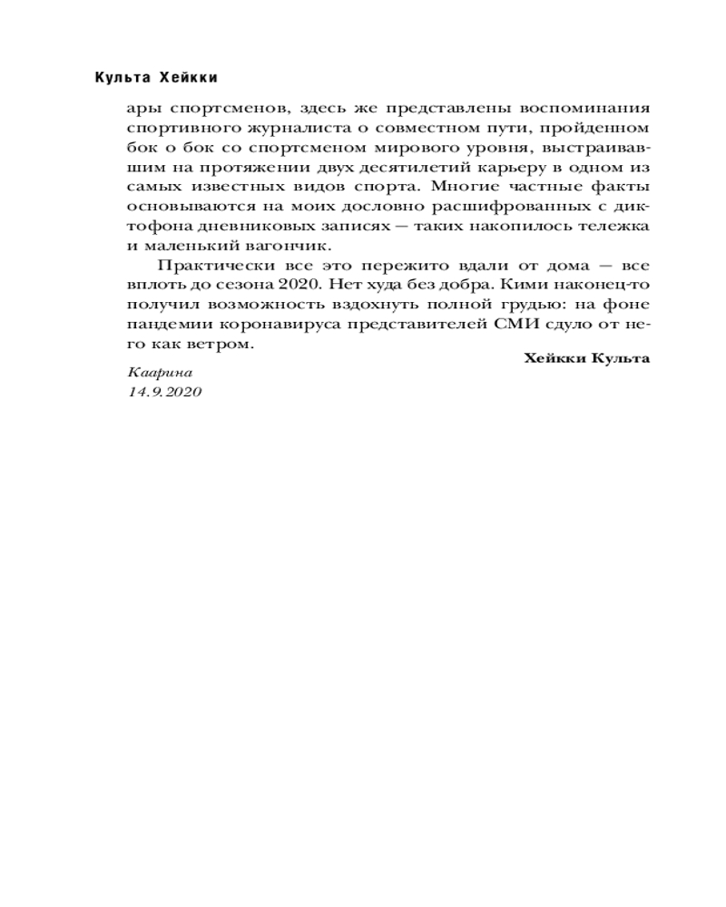 Культа Хейкки в этой биографической книге раскрыл Райкконена с новой стороны, рассказывая о тех сторонах жизни великого гонщика, которую поклонники еще не видели.