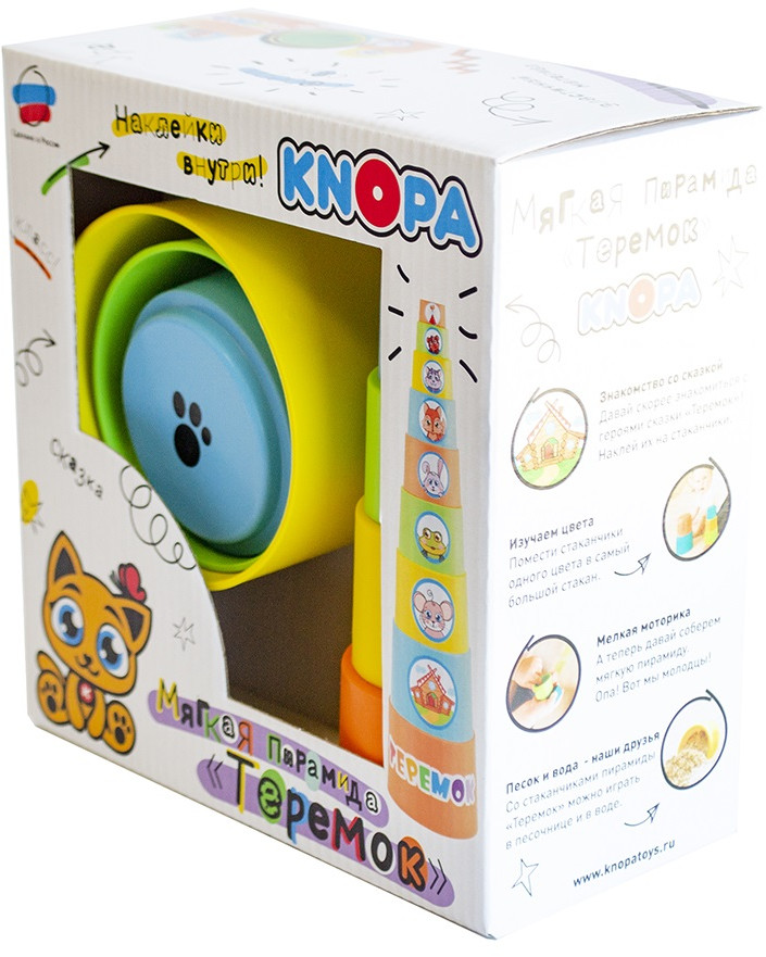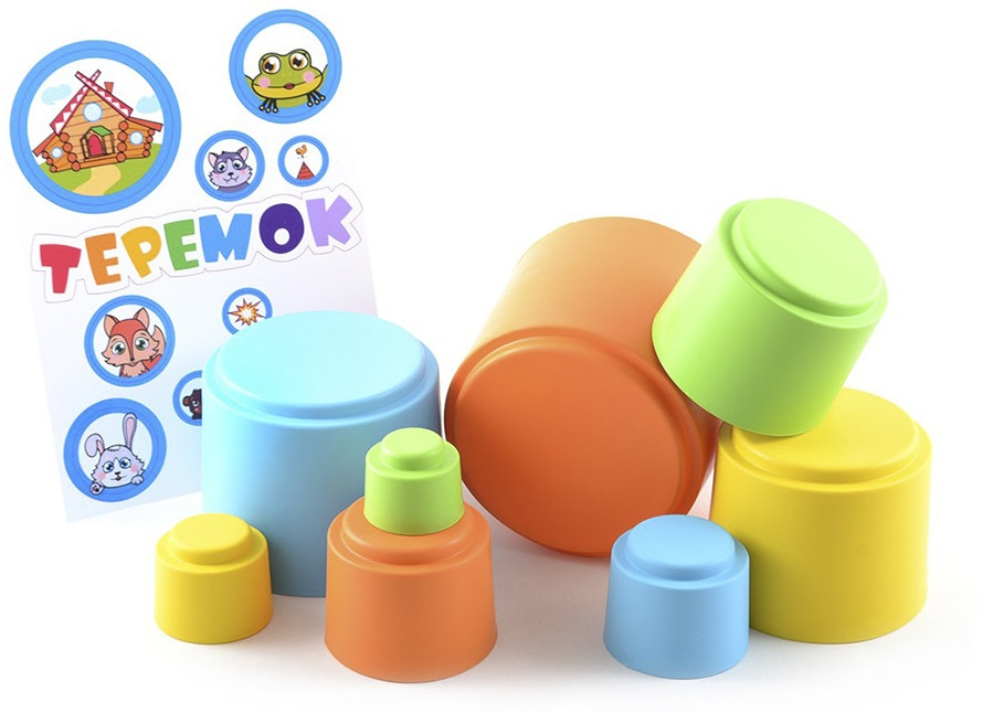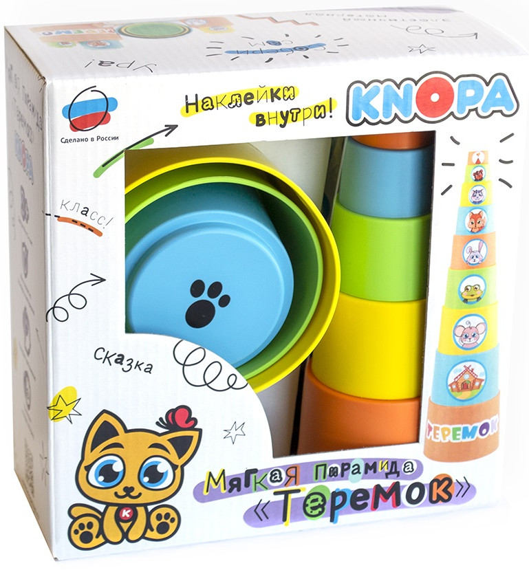 Мягкая пирамидка «Теремок» — первая развивающая игрушка для крох, которые уже умеют контролировать свои движения и готовы обучаться навыкам составления предметов по принципу «больше-меньше», «подходит — не подходит», «сверху-снизу», «над-под». Пирамидка «оживит» новыми персонажами давно известную народную сказку. Игрушка совершенствует мелкую моторику рук, координацию движений, помогает изучению цветов, размеров, названию зверей. Пирамидки-стаканчики от Кнопы уникальны по своему составу, они изготовлены из мягкого прочного материала, который абсолютно безопасен для малышей. Стаканчики от пирамидки можно сжимать, кидать и даже грызть. Они прекрасно моются, не ломаются, устойчивы к перепаду температур. Наклейки в комплекте. |