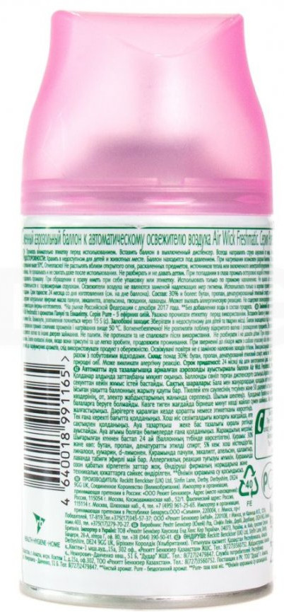 Air Wick Freshmatic Pure — cменный баллон для автоматического аэрозольного освежителя воздуха. Просто вставьте аэрозоль в держатель, и Air Wick Freshmatic будет автоматически распылять свежий и легкий аромат в Вашем доме, радуя вас и ваших близких.