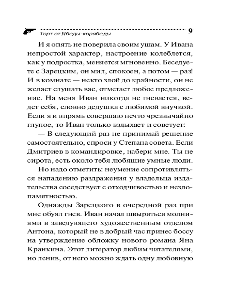 Торт от Ябеды-корябедыВ данный момент этот товар отсутствует в продаже. Возможно, у нас найдется аналогичный или похожий товар здесь. Серия: Иронический детектив (обложка) Виола Тараканова никогда не пройдет мимо чужой беды. Вот и сейчас она решила помочь совершенно посторонней женщине. В ресторане, где ужинали Вилка с мужем Степаном, к ним подошла незнакомка, бухнулась на колени и попросила помощи. Но ее выставила вон Нелли, жена владельца ресторана Вадима. Она сказала, что это была Валька Юркина — первая жена Вадима; дескать, та отравила тортом с ядом его мать и невестку. А теперь вернулась с зоны и ходит к ним. Юркина оказалась настойчивой: она подкараулила Вилку и Степана в подъезде их дома, умоляя ее выслушать. Ее якобы оклеветали, она никого не убивала... Детективы стали выяснять детали старой истории. Всех фигурантов дела нельзя было назвать белыми и пушистыми. А когда шаг за шагом сыщики вышли еще на целую серию подозрительных смертей, Виола впервые растерялась. Но лишь на мгновение. Ведь девиз Таракановой: «Если упала по дороге к цели, встань и иди. Не можешь встать? Ползи по направлению к цели». |