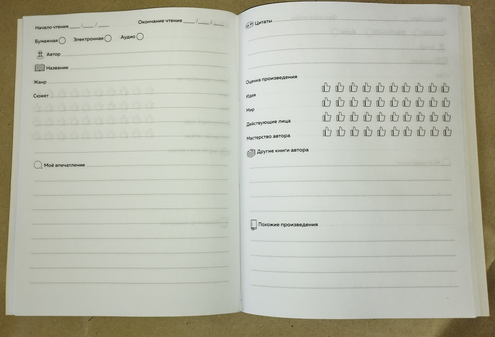 Мой первый читательский дневник. Пробую для себя новый формат. В целом мне пока нравится. Страницы тонкие и текстовыделитель легко пропитывает их и его видно на обратной стороне листа. Обложка минималистичная и ненавязчивая. Очень нравится. Объём дневника хороший. Если читаете по одной-две книги в месяц, то, думаю, на год его точно хватит.