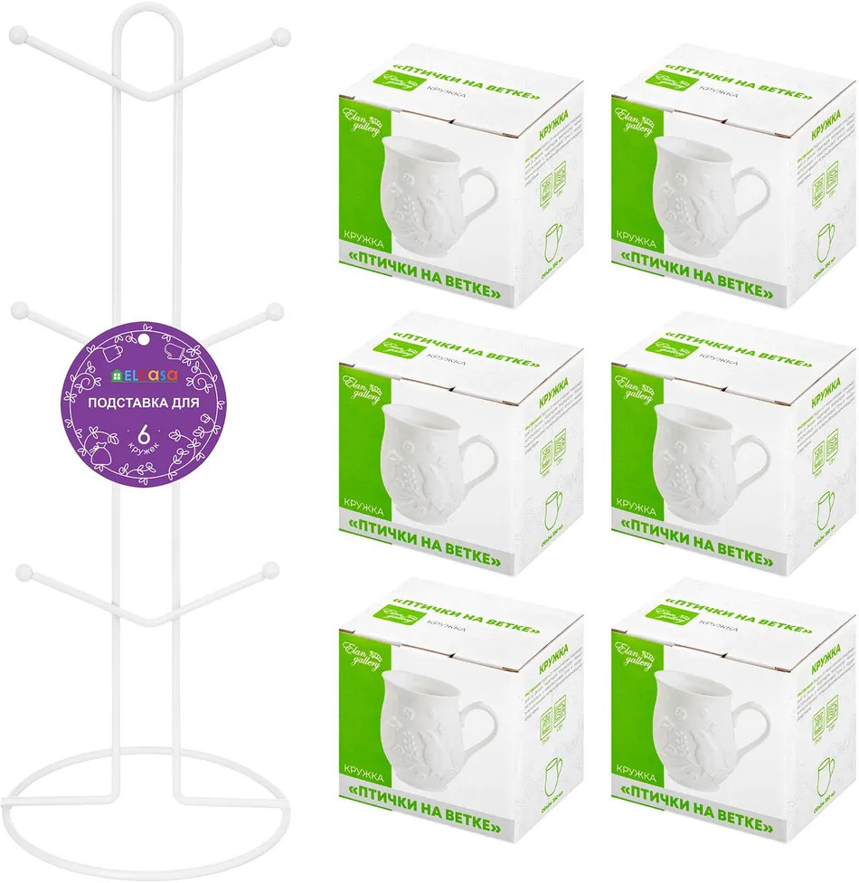 Elan Gallery Набор кружек на подставке «Птички на ветке»-20%