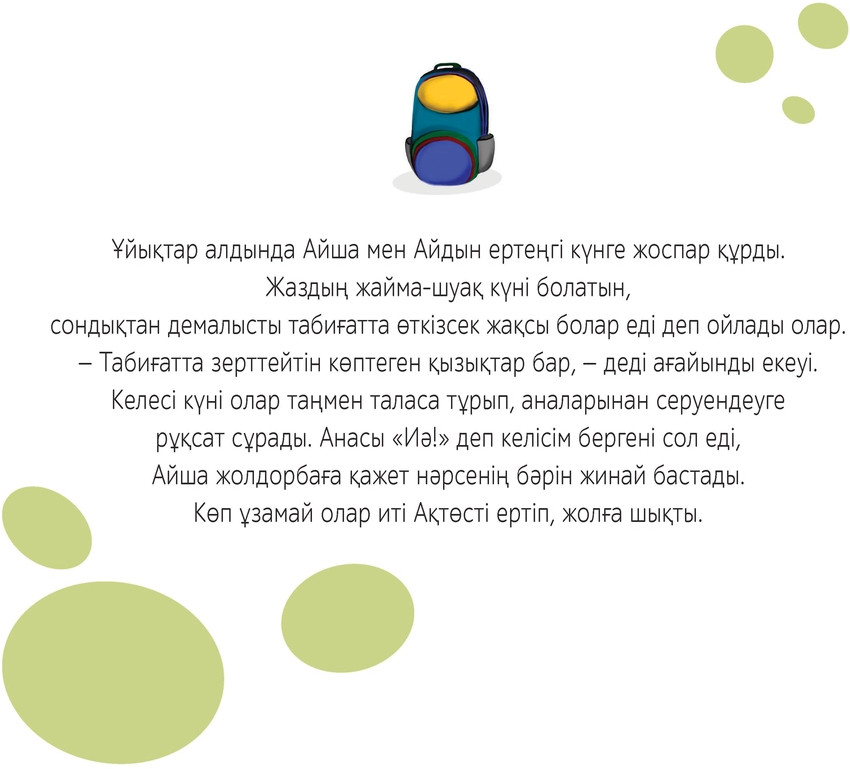 Қазіргі заманда кеңінен танымал ұялы телефон немесе планшет сияқты технологиялық құрылғыларды пайдалана отырып, кітаптағы бейнелерді кеңейтілген шындық түрінде көруге болады. Кішкентай оқырмандар мәтінді оқи отырып, аяғын жарақаттап алған Айдынға Айшаның қалай алғашқы көмек көрсеткенін 3D форматта тамашалай алады. |