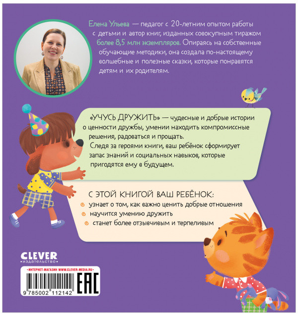 Елена Ульева — педагог с 20‑летним опытом работы с детьми и автор книг, изданных совокупным тиражом более 8,5 млн экземпляров. Опираясь на собственные обучающие методики, она создала по‑настоящему волшебные и полезные сказки, которые понравятся детям и их родителям. «Учусь дружить»- чудесные и добрые истории о ценности дружбы, умении находить компромиссные решения, радоваться и прощать. Следя за героями книги, ваш ребёнок сформирует запас знаний и социальных навыков, которые пригодятся ему в будущем.