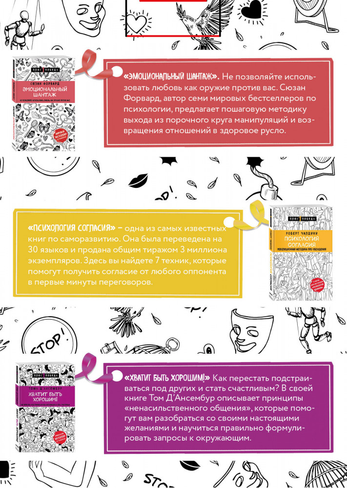 Серия: Психология. Плюс 1 победа (новое оформление, обложка) Три мировых бестселлера в одном комплекте. В своих книгах Тома Д'Ансембур, Роберт Б. Чалдини и Сьюзан Форвард дают конкретные инструкции, чтобы достичь душевного покоя и разобраться с собственными желаниями. |