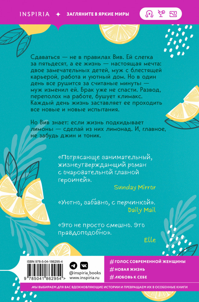 Серия: Cupcake. Романтические комедии (обложка) «Когда жизнь подкидывает тебе лимоны» — история, которая откликнется любой женщине. После 50-ти жизнь только начинается, несмотря на все трудности. Сдаваться — не в правилах Вив. Ей слегка за пятьдесят, а ее жизнь — настоящая мечта: двое замечательных детей, муж с блестящей карьерой, работа и уютный дом. Но в один день все рушится за считаные минуты — муж изменил ей. Брак уже не спасти. Развод, переполох на работе, бушует климакс. Каждый день жизнь заставляет ее проходить все новые и новые испытания. Но Вив знает: если жизнь подкидывает лимоны — сделай из них лимонад. И, главное, не забудь джин и тоник. |