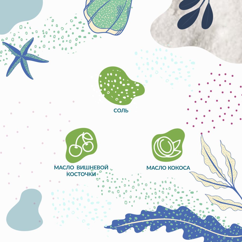 Морская соль, масло кокоса, масло виноградной косточки, плантапон, миритол, цетиол.