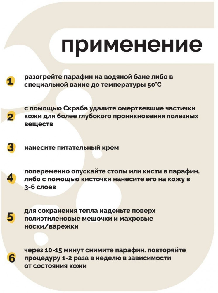 • повторяйте процедуру 1-2 раза в неделю в зависимости от состояния кожи. Одного брикета парафина достаточно для проведения 1 процедуры парафинотерапии рук. Если Вы используете специальную ванну, то потребуется 3-4 брикета, чтобы заполнить необходимый объем.